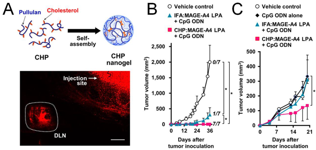 Anti-tumor efficacy improved by efficient lymphoid draining and retention of nanoparticle-based cancer vaccines. (A) Lymphoid draining of a fluorophore-labeled pullulan nanogel 6 h post subcutaneous injection to mice. Scale bar, 1 mm. The nanogel loaded with a long peptide antigen (LPA) MAGE-A4 achieved better prophylactic (B) and therapeutic (C) efficacy compared to the soluble antigen; (B) Mice were immunized on day -7, followed by inoculation of tumor on day 0; (C) mice were inoculated with tumor on day 0, followed by immunization on day 4 and 11. Reproduced with permission [].