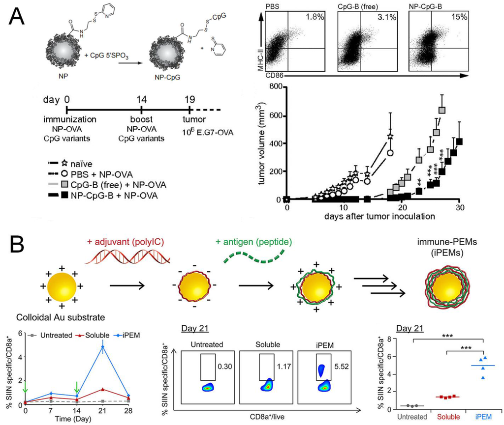 Co-delivery of antigens and adjuvants by nanoparticles. (A) TLR9 agonist CpG was conjugated on the surface of polymeric nanoparticles via disulfide exchange. The particulate adjuvant improved DC activation in vitro as well as prophylactic efficacy against tumor in vivo, compared with the soluble CpG; (B) TLR3 agonist poly I:C and an antigen peptide were complexed onto gold nanoparticles via electrostatic interactions, and elicited more antigen-specific CD8+ T cells compared with the soluble vaccine. Panel (A) reproduced with permission []; Panel (B) reproduced with permission [].
