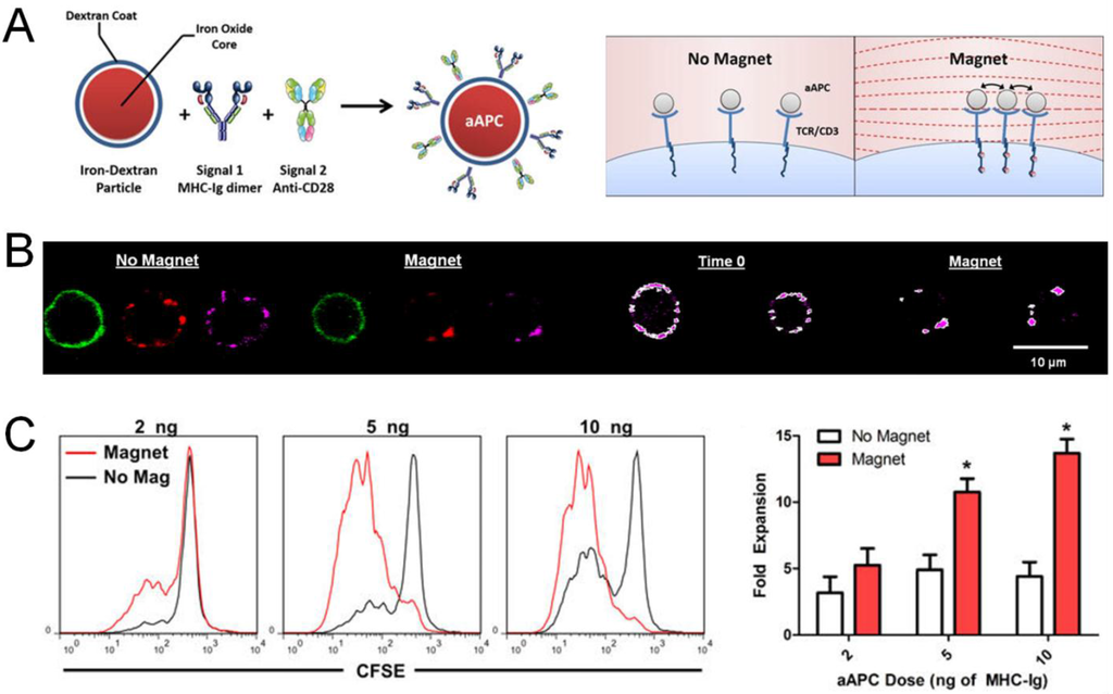 Artificial antigen-presenting cells (aAPCs) for activation of T cells. (A) aAPCs composed of an iron nanoparticle core and dextran shell conjugated with stimulatory molecules induced clustering of T-cell receptors (TCRs) under magnetic field; (B) TCR clustering was visualized by fluorescence imaging. Green, lymphocyte marker on T cells; red: aAPCs; magenta: CD3ε on T cells; (C) Proliferation of T cells was enhanced by aAPC-induced TCR clustering in vitro. Reproduced with permission [].