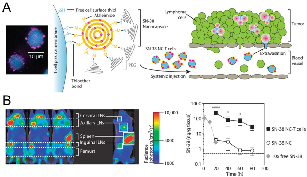 Engineered T cells for cancer therapy. (A) T cells (blue) conjugated with nanoparticles (magenta) loaded with a chemodrug (SN-38) were used for drug delivery to lymphoma; (B) T cells with surface-bound chemodrug preferentially accumulated in tumor-bearing lymphoid tissues following systemic administration, and significantly improved the drug distribution in lymph nodes, compared with equivalent or 10-fold higher dose of the nanoparticulate or soluble drug, respectively. Reproduced with permission [].