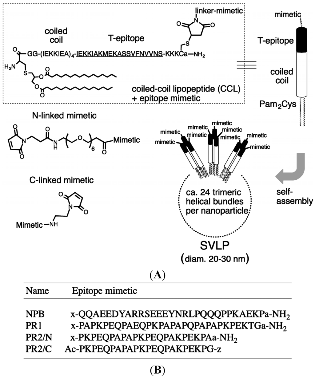 Components and their self-assembly into SVLPs. (A), SVLPs are composed of a synthetic coiled-coil lipopeptide (CCL), which contains a heptad repeat (IEKKIEA)4 linked to a promiscuous T helper epitope (underlined) and to the TLR-2/6 ligand Pam2Cys. B-cell epitope mimetics can be conjugated to the unique Cys, as shown. The C-terminal a-NH2 is D-Ala-amide to protect against digestion with carboxypeptidases. The CCLs form trimeric helical bundles that self-assemble into 20–30 nm diameter nanoparticles (SVLPs) with a lipid-chain core; (B) In this work, PRR-derived peptides were linked through either the N- or C-terminus (represented in the sequences by x and z, respectively) to the unique Cys of the CCLs using the linkers shown in (A).