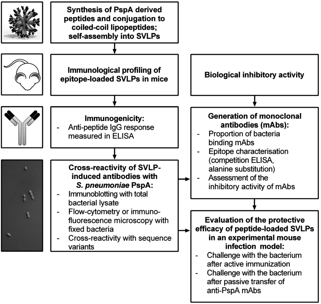 In this work, epitope mimetics based on pneumococcal surface protein A (PspA), displayed on the surface of the SVLPs, have been tested as vaccine candidates for their ability to provide protection against pneumococcal infection. An overview of the work-flow undertaken is given in Figure 2.