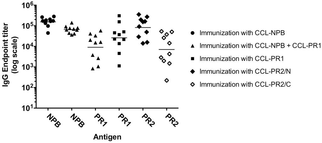 NMRI outbred mice (10 per group) were immunized twice with 20 µg doses of each SVLP construct: CCL-PR1, CCL-NPB, CCL-PR2/N, CCL-PR2/C or a mixture of CCL-NPB + CCL-PR1, each in PBS without adjuvant. ELISA of sera collected pre-immune and after the second immunization showed that most mice developed strong antigen-specific IgG responses against the target peptide (Figure 3). SVLPs comprising a mixture of CCL-NPB and CCL-PR1 elicited high antibody titers against both the NPB and the PR1 epitopes. The CCL-PR2/C construct elicited lower titers of PR2-specific IgG antibodies compared to CCL-PR2/N (p = 0.0065). Pre-immune sera showed no reactivity in ELISA.