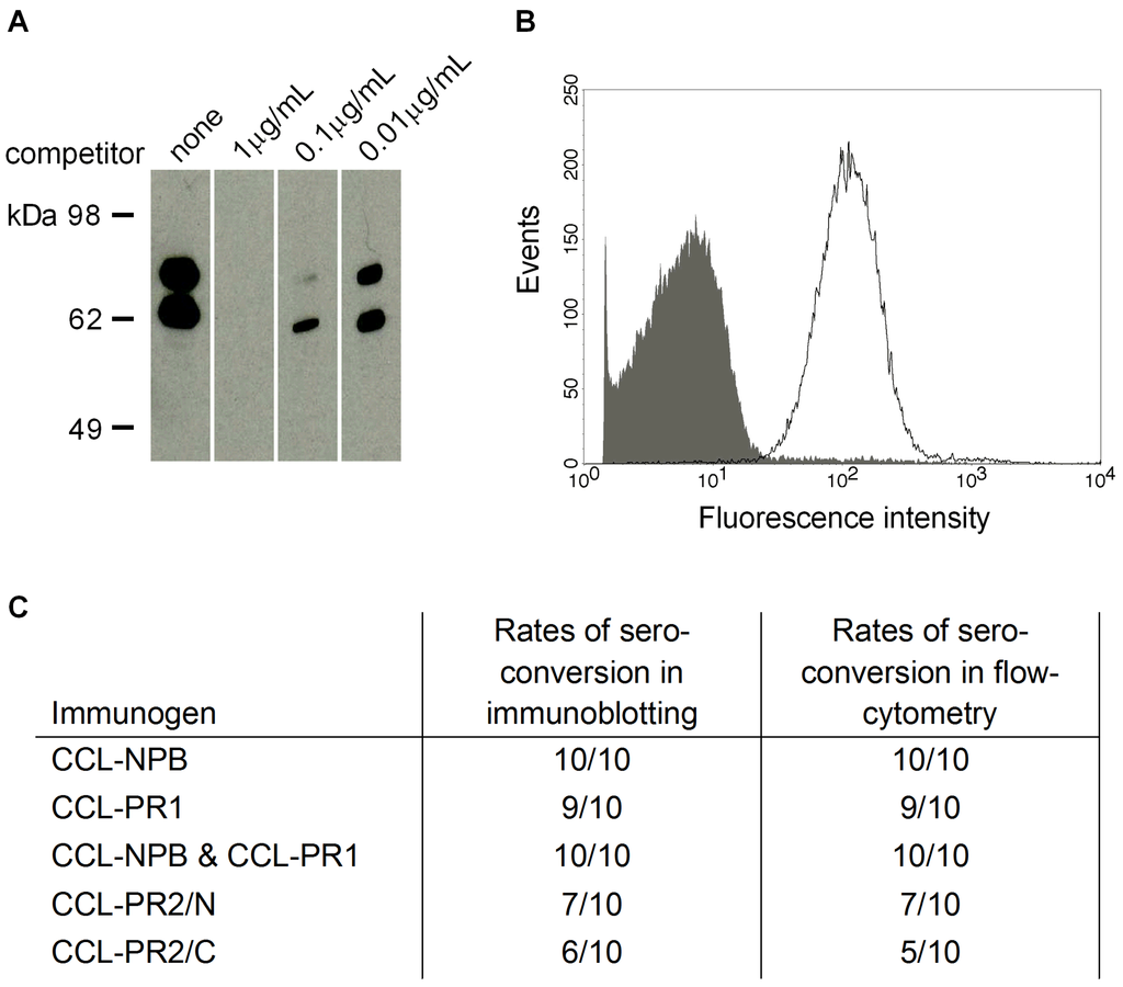 Cross-reactivity of sera raised against peptide-loaded SVLPs with S. pneumoniae. (A), competition Western blot analysis with total bacterial lysate of the S. pneumoniae 1577 clinical isolate and the PR2/N synthetic peptide. Total lysates were separated by SDS-PAGE under reducing conditions and blotted onto a nitrocellulose membrane. Serum of a NMRI mouse immunized with CCL-PR2/N was pre-incubated with or without peptide competitor and subsequently added to cut strips. Immune serum was used at a dilution of 1:2000 and the competitor at a concentration of 1, 0.1 or 0.01 μg/mL; (B), flow cytometry-based surface staining was performed with formalin-inactivated pneumococci (1577) using CCL-PR2/N specific mouse serum and fluorescently labeled secondary antibodies. The signal resulting from staining with pre-immune serum is shown as gray area; PspA specific signals are shown with a black line. Sera were used at a dilution of 1:100; (C), Rates of sero-conversion for immunoblotting and flow-cytometry analyses with sera from immunized mice taken after the second immunization with peptide-loaded SVLPs.