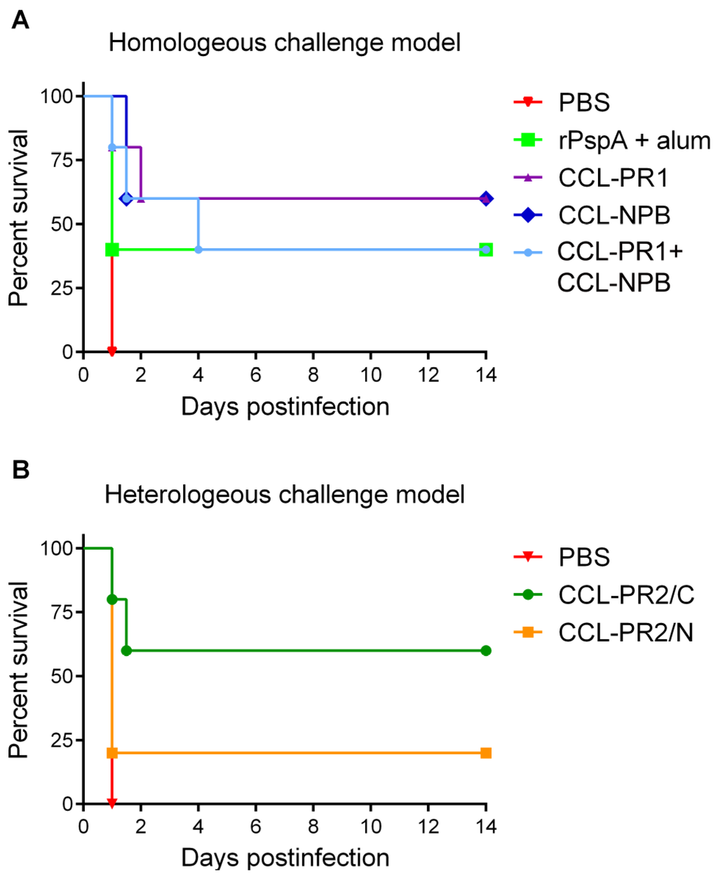 Mice were immunized either with rPspA formulated with alum, or with PRR mimetic-loaded SVLPs, and then challenged intravenously with a lethal dose of S. pneumoniae strain 1577. Mice that developed signs of illness (ruffled fur, hunched back, paralysis or other symptoms) were euthanized. Negative control mice that received PBS prior to challenge died or became moribund within 24 h after challenge (Figure 5A). Immunization with epitope-loaded SVLPs significantly delayed onset of illness and some mice had not developed disease symptoms by day 14 after the challenge, at which time the experiment was terminated. No difference in efficacy was observed between NPB and PR1-loaded SVLPs and both formulations were slightly more effective than rPspA. The combination CCL-NPB + CCL-PR1 (Figure 5A, mixture) elicited longer median survival time than rPspA but was comparable in terms of overall protection.