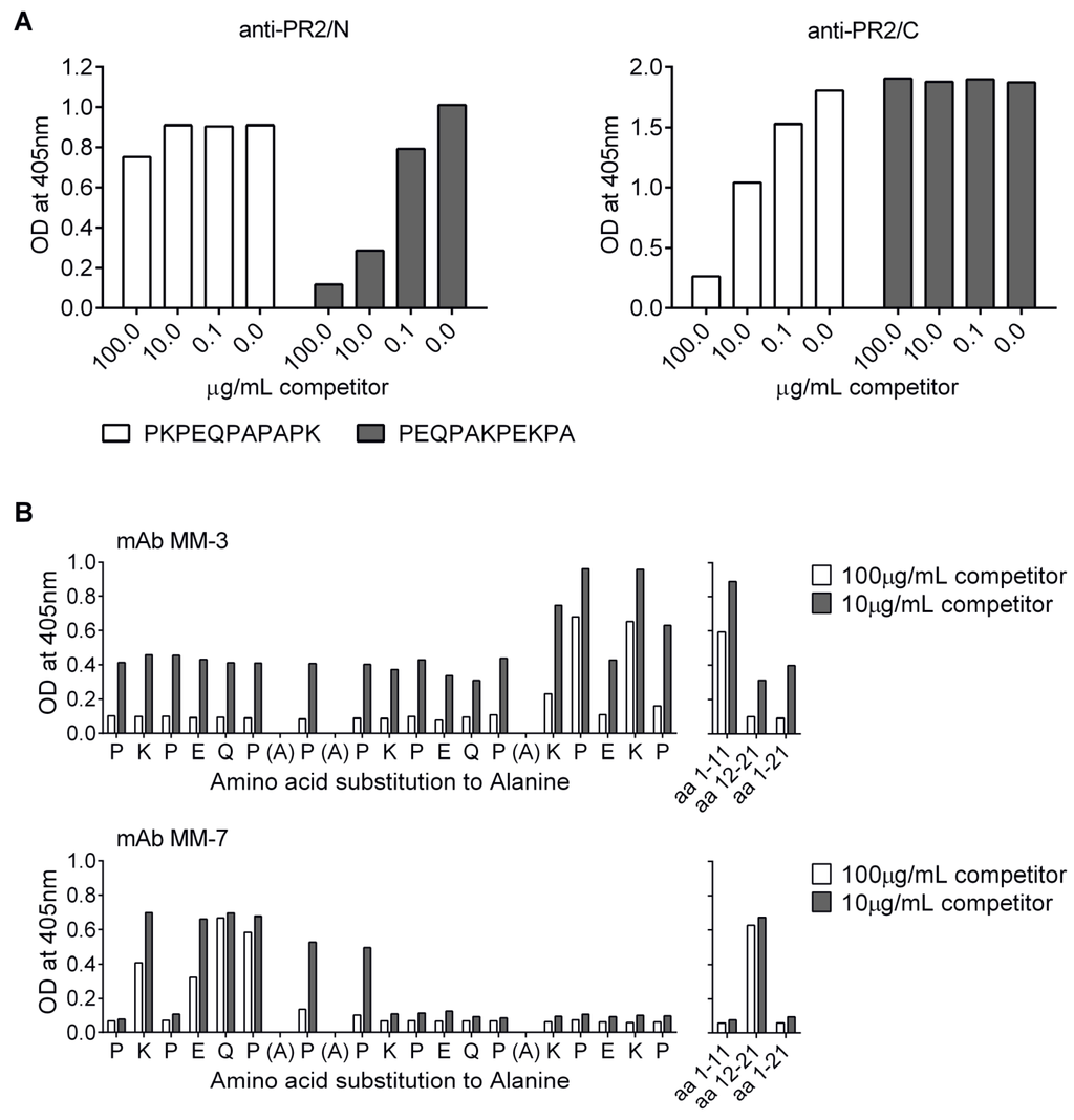 To characterize the epitopes in more detail, seven mAbs (MM-1 to MM-7) were generated from spleen cells taken from a CCL-PR2/N immunized mouse. The ability of the seven mAbs to bind PspA on streptococcal cells was analyzed by immunofluorescence microscopy. Only MM-7 cross-reacted with the native antigen and stained the bacterial cell surface (Figure 6C). The epitopes recognized by the mAbs MM-1 to MM-7 were mapped by competitive ELISA, using PR2-coated ELISA plates and competing peptides, including shortened peptides representing either amino acids 1–11 or 12–21 of PR2, as well as a panel of 18 synthetic 21-mer peptides representing an alanine scan of the PR2 sequence (Figure 6B). In this way, mAbs MM-1 to MM-6 were shown to bind to the C-terminal part and only the S. pneumoniae cross-reactive mAb MM-7 to the N-terminal part of PR2. Representative results for mAbs MM-3 and MM-7 are shown in Figure 6B. Moreover, the alanine-scan identified key residues in each motif that are important for binding to these two antibodies (see Figure 6B). These include KPEKP for binding MM-3, and KPEQP for recognition by MM-7.