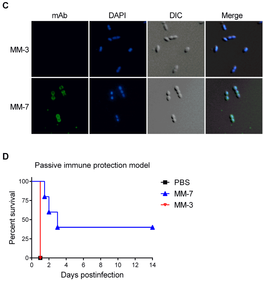 For immunofluorescence microscopy, 30 µL droplets of formalin solution were placed into each well of a pre-coated Poly-L-Lysin microscope glass slide. Ten microliters of a bacterial suspension containing approximately 2.6 × 108 CFUs were added to each well and incubated for 30 min at room temp. After washing, wells were blocked with 1% BSA in PBS. Immunostaining was performed by incubating the wells with an appropriate mAb or serum dilution in blocking solution for 1 h at room temperature. After washing, cells were incubated with secondary antibodies specific for mouse IgG conjugated with Alexa-Fluor 488. Before the immunoreactivity was analyzed with a fluorescence microscope, the wells were washed, mounted with ProLong® Gold antifade reagent (Invitrogen) and covered with a coverslip.