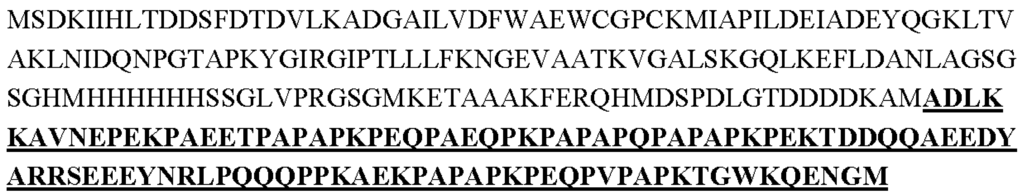 The amino acid sequence of the fusion protein (rPspA), comprising the PRR of PspA linked to thioredoxin (Trx). The PRR is bold and underlined.