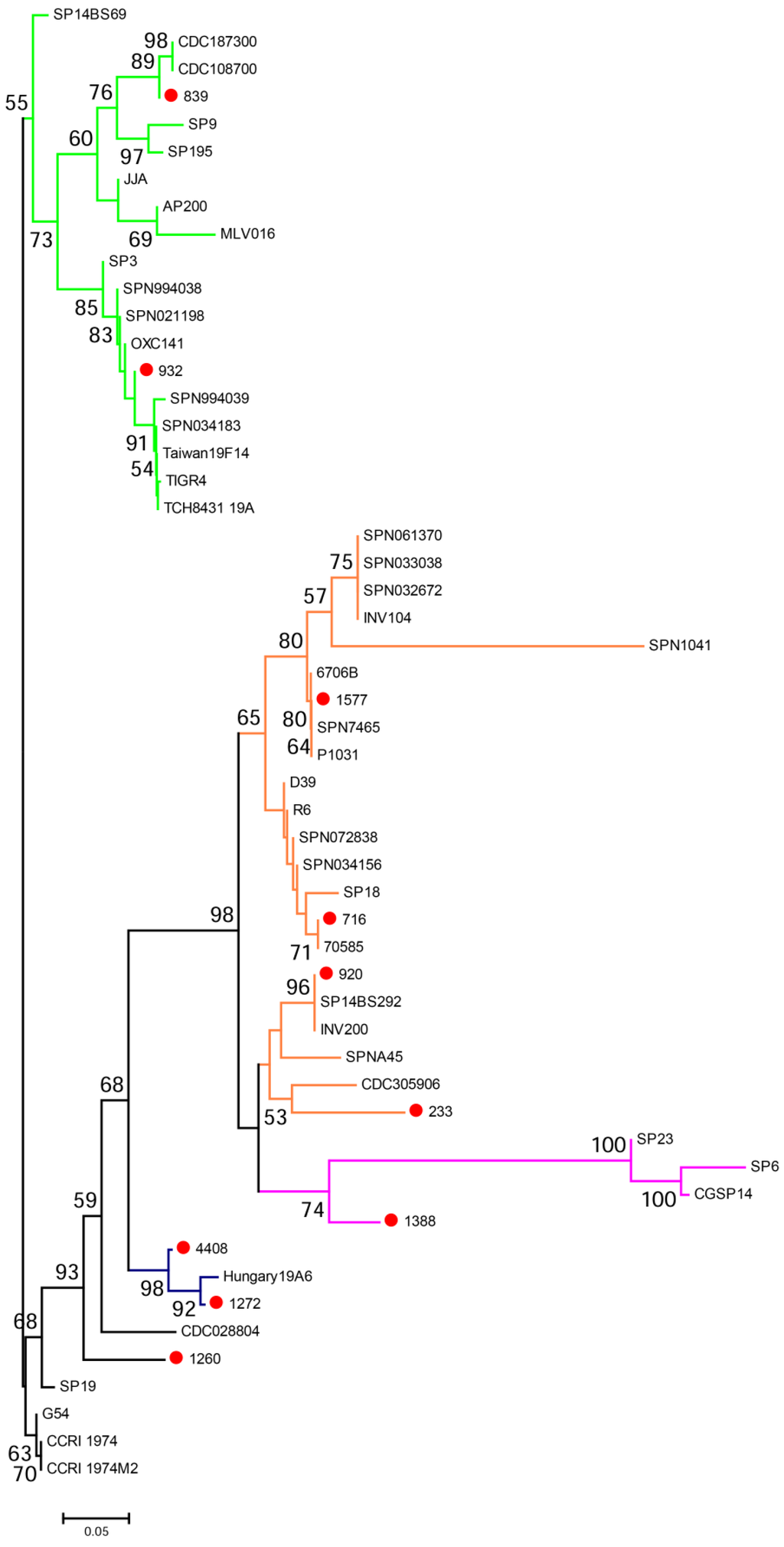 Maximum likelihood phylogenetic tree of the PRR sequences of 10 S. pneumoniae clinical isolates (marked with a red dot) and of 44 S. pneumoniae genomes from the NCBI database using a general time-reversible (GTR) substitution model with γ correction for among-site rate variation. The branches are annotated with their bootstrap support (numbers in the branch). Marked pneumococcal clinical isolates were tested for their cross-reactivity with serum IgG antibodies induced upon immunization with epitope-loaded SVLPs. Colored branches correspond to pspA allelic variants that have been classified into clades according to Hollingshead SK et al. [30], green: clade 3; orange: clade 1; pink: clade 2; blue: clade 5; black: clade 4).