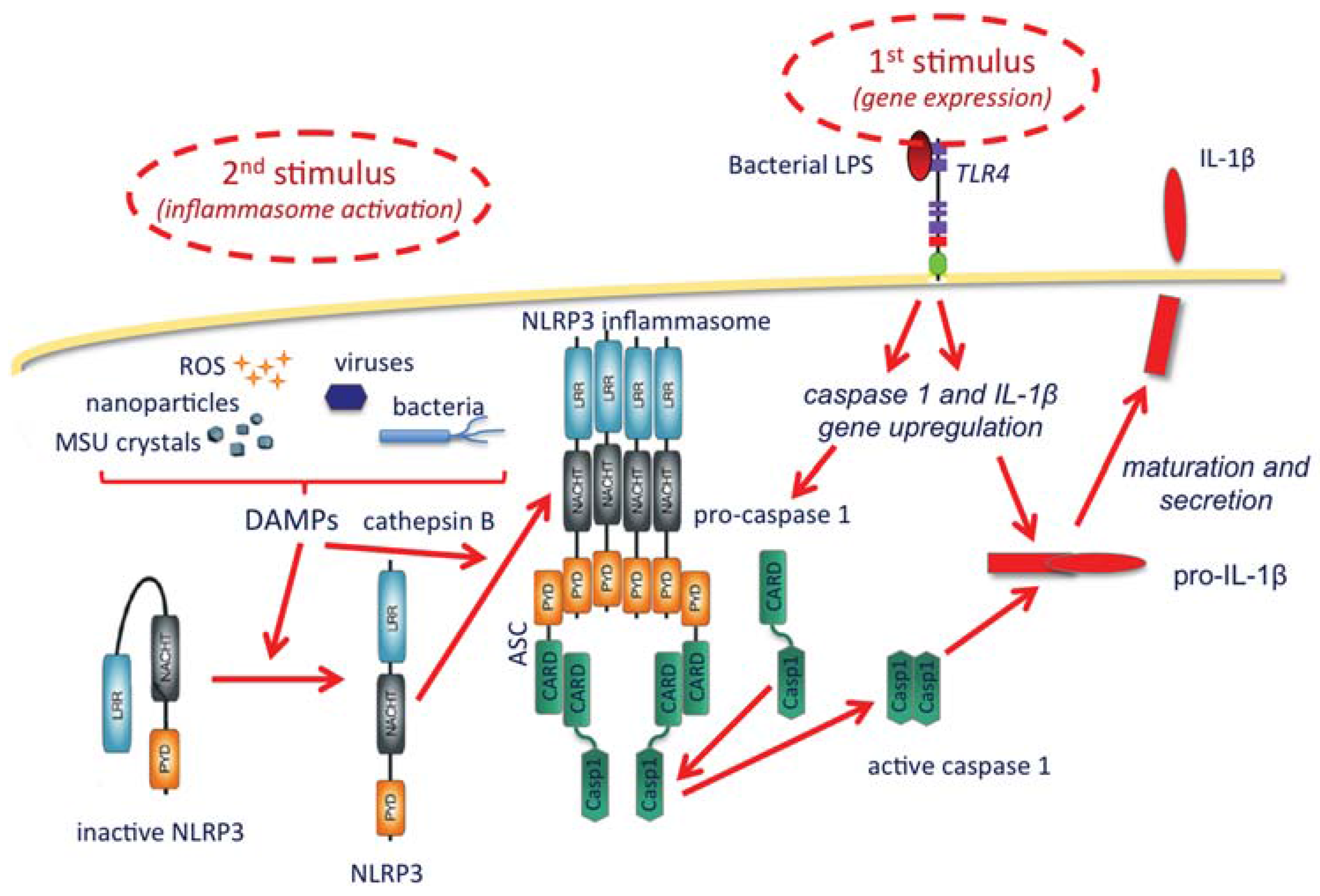 The NLRP3 activation and the production of IL-1β. A first stimulus, typically TLR agonists such as bacterial LPS (upper right), starts the activation by upregulating the expression of the genes encoding IL-1β and caspase-1, which are synthesized as inactive precursors (pro-caspase-1 and pro-IL-1β). The inflammasome is activated by a second type of stimuli (upper left), occurring intracellularly and being either endogenous or exogenous (particles and crystals of various origin, microorganisms, and reactive oxygen species), collectively dubbed danger-associated molecular patterns (DAMPs). These are able to change the inactive conformation of NLRP3, thus allowing the complexing of a number of NLRP3 molecules, an event facilitated by cathepsin B (released from ruptured lysosomes). The inflammasome assembles with the recruitment of adaptor proteins (in this case ASC), which in turn can take in the pro-caspase-1 and induce its cleavage and activation. Active caspase-1 then cleaves and helps the secretion of mature active IL-1β.