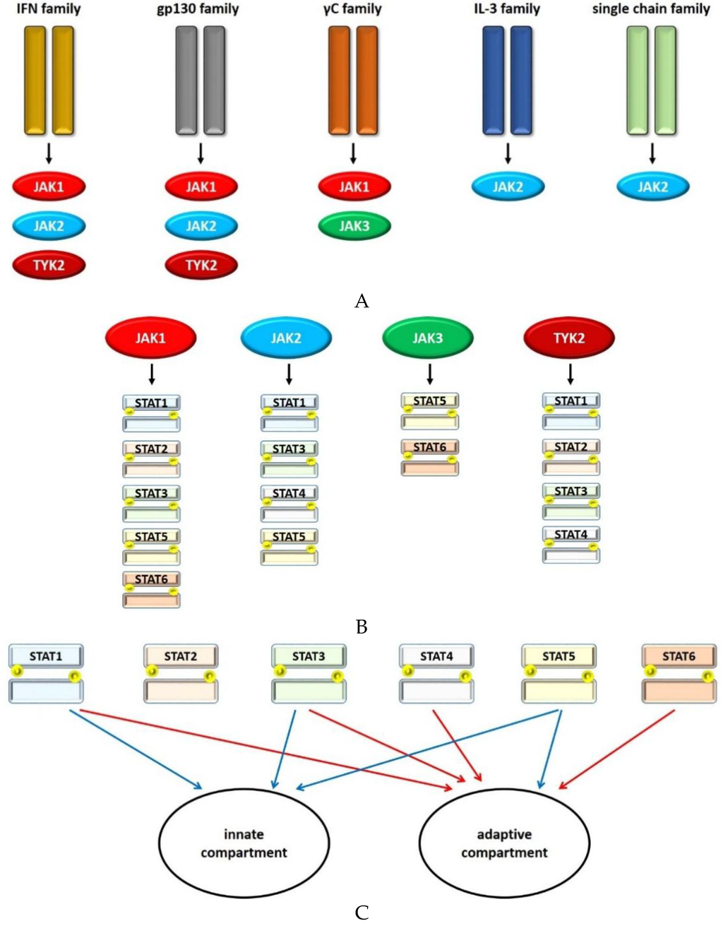 Schematic illustration of the signaling network of JAK/STATs in IBD. (A) Different receptor families activate distinct sets of JAK molecules. (B) JAK molecules, in turn, phosphorylate assorted STATs. (C) Based on present evidence, these seem to exert either pro-inflammatory (red arrows) or protective (blue arrows) functions concerning the pathogenesis of IBD in adaptive and innate immunity.
