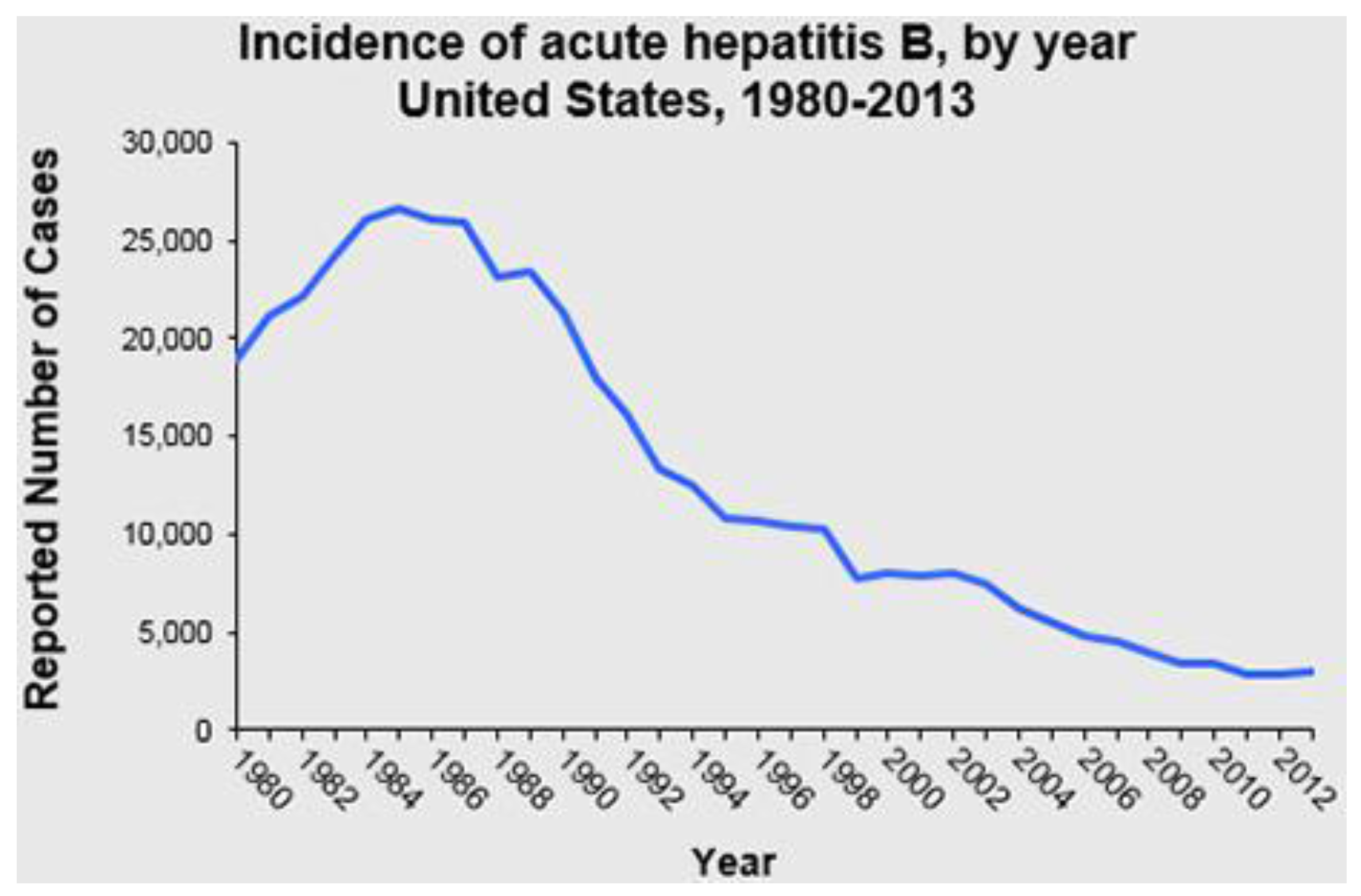 Reported acute hepatitis B incidence, United States, 1980-2013 [1]. Figure is used with permission from the publisher.
