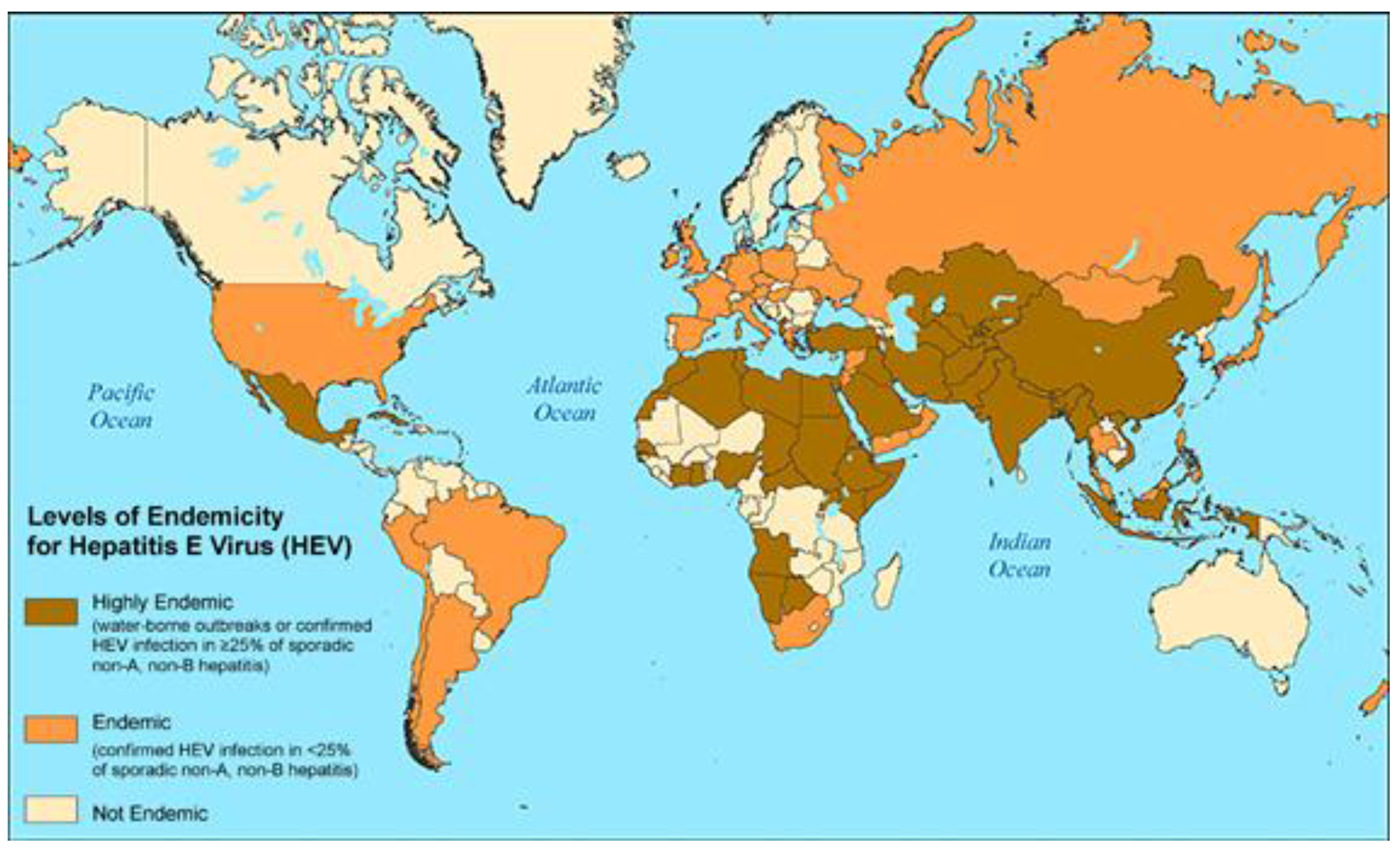 HEV was first discovered in 1983 [66]. For many years HEV was thought to be restricted to developing countries, was known to be an RNA virus causing short-lived disease, and was notorious for causing up to 30% mortality in pregnant women. Now emerging knowledge is that there are four genotypes and the first two are known to infect humans. Genotypes 3 and 4 were initially thought to be restricted to animal vectors. However, it is now apparent that immunosuppressed patients such as organ transplant recipients are not only susceptible to disease but the liver disease can be chronic and sometimes even fatal from all four genotypes [67]. Ribavirin treatment has been efficacious in some [67]. Patients with chronic liver disease may have high rates of morbidity and mortality [68]. The global disease burden is now recognized to be up to ~20 million with 70,000 fatalities/year [69]. Regions with prevalence rates >25% include Central America, large parts of Africa, and all of Asia (see Figure 5). Similar to HAV, improved water sanitation, personal and hand hygiene will be essential in decreasing these prevalence rates.