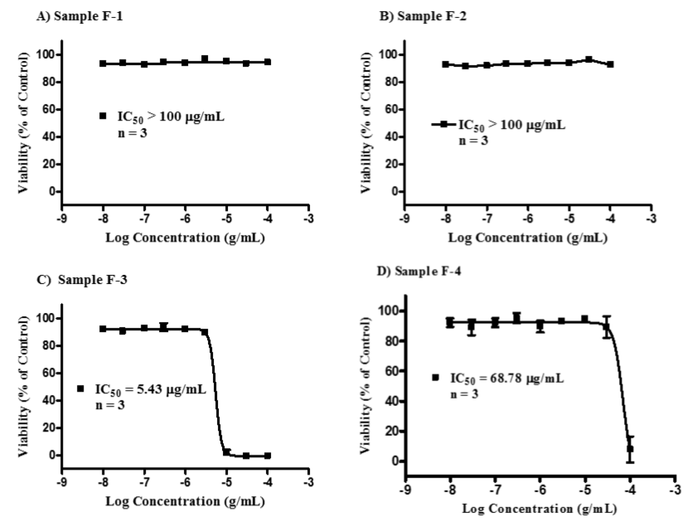 Cytotoxicity of the bee venom sample fractions F-1–F-4 against U937 cells. Fraction samples F-1 (A) and F-2 (B) were non-cytotoxic, each with an IC50 value >100 μg/mL. Fraction sample F-3 (C, melittin) was the most cytotoxic with an IC50 of 5.43 (95% CI 4.43–6.66) µg/mL, while fraction sample F-4 (D, lipid) had an IC50 value of 68.78 µg/mL.