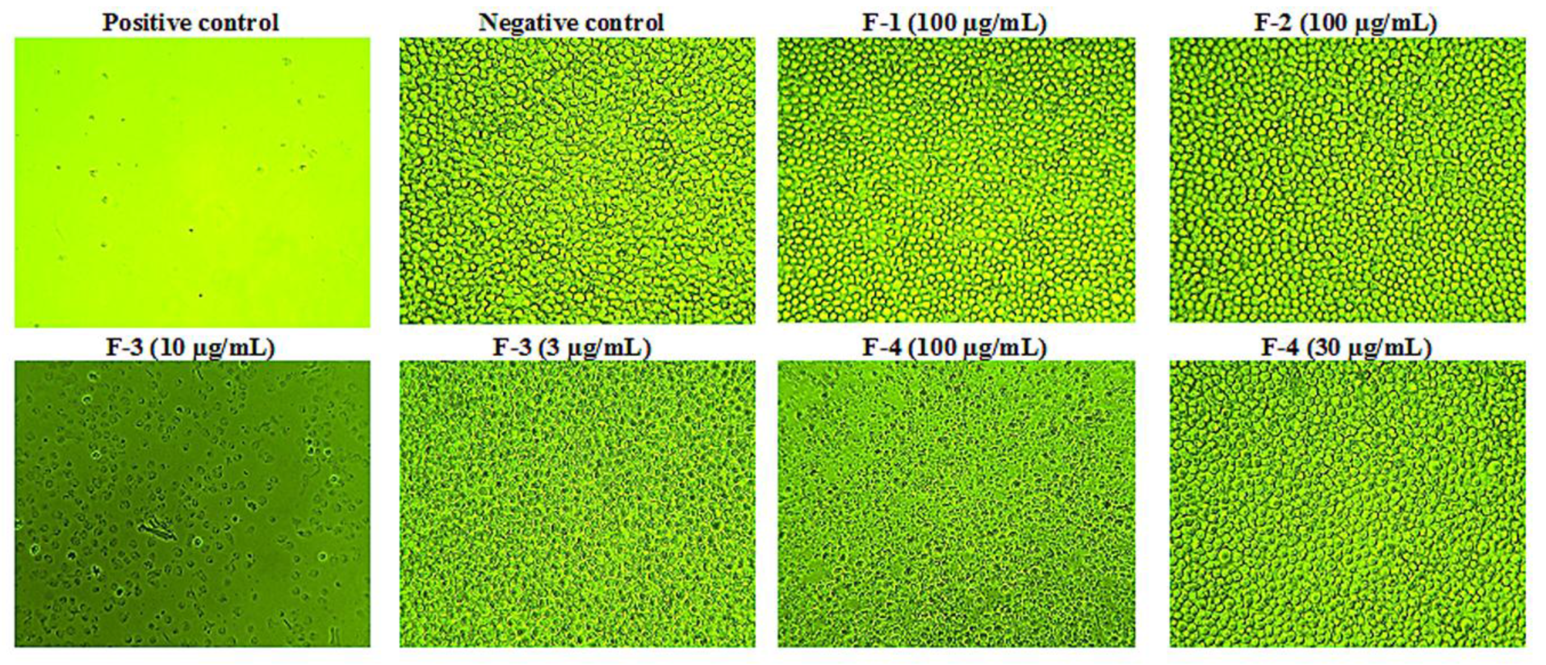 Cytotoxic effects of bee venom fractions on U937 cells. Fractions F-1 and F-2 were non-cytotoxic at the highest concentration of 100 µg/mL used, while F-3 was the most cytotoxic on the cells, as necrotic effects were observed even at 10 μg/mL (IC50 5.4 µg/mL). On the other hand, F-4 was cytotoxic above 30 μg/mL with an IC50 of 68.8 μg/mL (n = 3). (Magnification = ×100).
