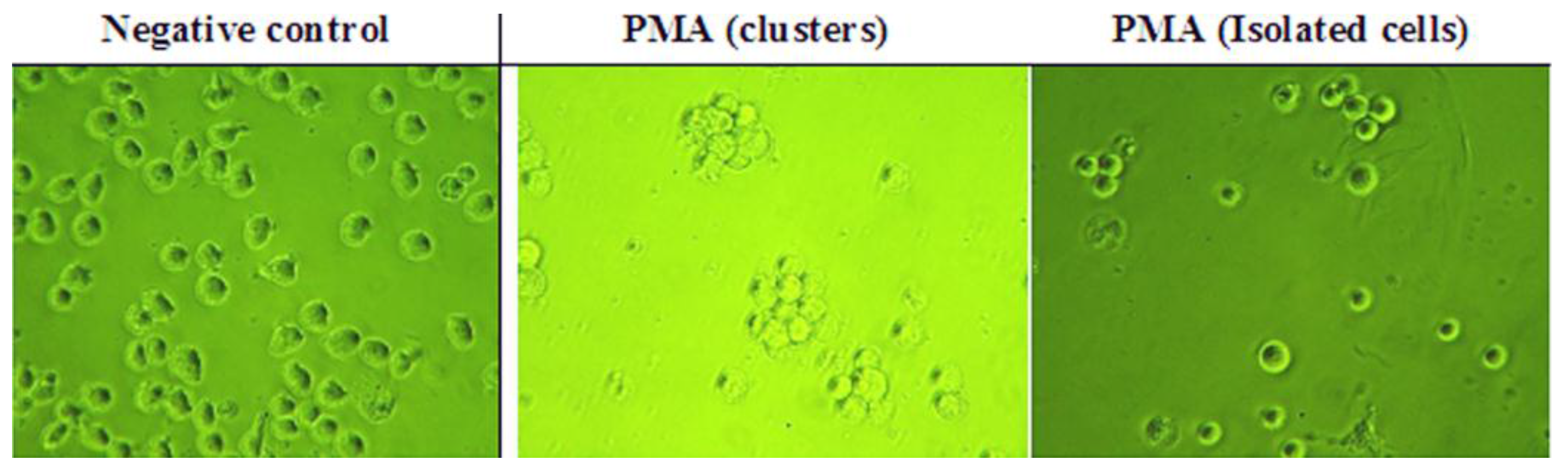 After the cells had been incubated in the presence of PMA, they were observed microscopically at 24 and 48 h for the presence of features that confirmed whether or not they had differentiated [37]. Micrographs were also taken of the treated cells and compared to those of U937 cells in control wells (absence of PMA) on the same plate (Figure 3), which confirmed the morphological changes expected.