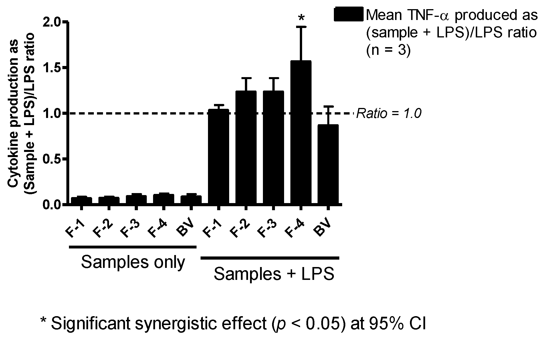 The BV fractions on their own did not induce significant TNF-α production in PMA-differentiated U937 cells relative to the negative control (culture media). However, when used in combination with LPS, there was a noticeable enhancement (ratio >1.0) in the amount of TNF-α produced compared to LPS alone. This was statistically significant (p < 0.05) only with F-4, which produced a 1.6-fold increase in TNF-α release from the cells (Figure 4).