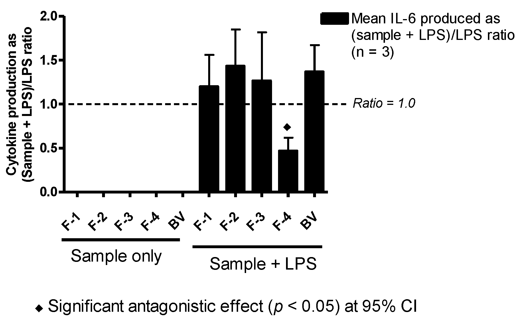 Effect of BV and its fractions with and without LPS on IL-6 production in PMA-differentiated U937 cells. The level of IL-6 produced by BV fractions alone was undetectable. However, in combination with LPS, Fractions F-1–F-3 and BV enhanced the level of cytokine produced by LPS though not significantly. Interestingly, F-4 significantly inhibited cytokine production by about 50% of the mean positive control (LPS) value (n = 3).