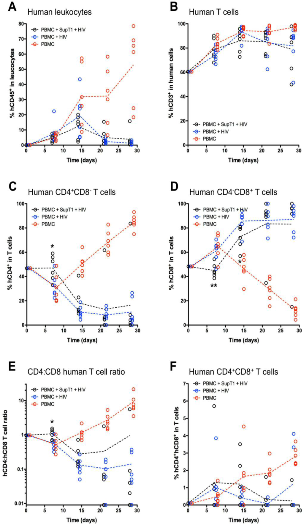 Monitoring of flow cytometry parameters. The graphs show individual values (open circles) and group mean values (dotted lines) for the following frequencies: (A) human leukocytes (hCD45+mCD45−) among total leukocytes; (B) T cells (hCD3+) among total human cells; (C) CD4+CD8− cells among total human T cells; (D) CD4−CD8+ cells among total human T cells; (E) the CD4:CD8 single-positive human T cell ratio; (F) CD4+CD8+ cells among total human T cells. For A, total leukocytes are intended as the sum of mouse (mCD45+) and human (hCD45+) leukocytes. For graphs in panels B, C, D, and F, the initial frequency in the inoculum is indicated at Day 0. * p < 0.05 and ** p < 0.01 (t-test between groups A and B).
