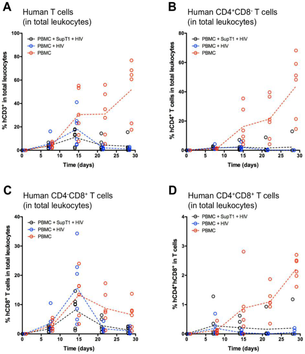 Normalized parameters in total leukocytes. The graphs show individual values (open circles) and group mean values (dotted lines) for the following frequencies: (A) human T cells (hCD45+mCD45−hCD3+) among total leukocytes; (B) human CD4+CD8− T cells among total leukocytes; (C) human CD4−CD8+ T cells among total leukocytes; (D) human CD4+CD8+ T cells among total leukocytes. Total leukocytes are intended as the sum of mouse (mCD45+) and human (hCD45+) leukocytes.