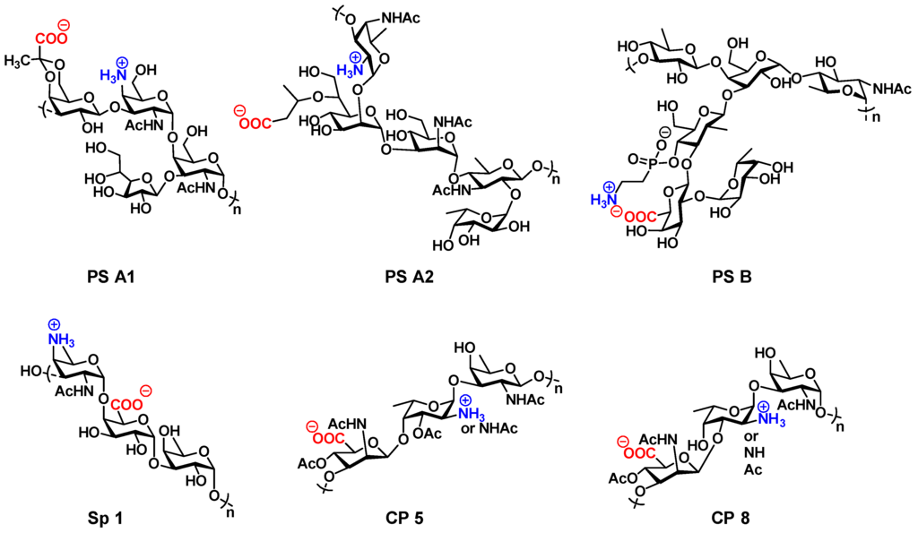 Among eight different polysaccharides isolated from B. fragilis (not all zwitterionic), ZPS PS A1 is the most abundant followed by ZPS PS B. Both of these capsular polysaccharides contain a zwitterionic charge character that is necessary for immunological T-cell mediated responses [20,74]. PS A1 consists of a tetrasaccharide core repeating unit (~120 repeating units) with a molecular weight of ~110 kDa having alternate opposite charges on adjacent monosaccharide units. The repeating unit is comprised of 2,4-dideoxy-4-amino-d-N-acetylfucose, d-N-acetylgalactosamine, d-galactopyranose, and d-galactofuranose with a 4,6-pyruvate acetal attached to the galactopyranose [74]. PS B, another high molecular weight capsular zwitterionic polysaccharide from B. fragilis is comprosed of repeating sugars [→3)-β-d-QuipNAc (1→4), α-d→Galp (1→4), α-l-QuiNAc (1→3), and branched from 3′-galactose is β-d-GlcpNAc (1→3), α-d-GalpA(1→3), and α-l-Fucp(1→2) [74]. PS A2 is a zwitterionic polysaccharide, isolated from the B fragilis 638R strain and is comprised of a pentasaccharide core repeating unit with the sequence: [→3)-α-d-AATp-(1→2)-α-d-HeppNAc-(1→3)-α-d-ManpNAc-(1→4)[α-l-Fucp-(1→2)]-β-d-ADGpA-(1→] [64].