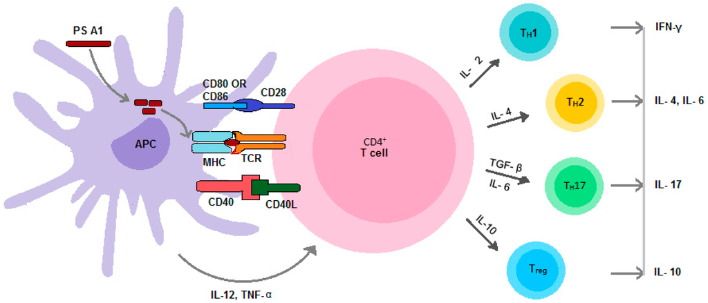PS A1 is also known to bind to toll like receptor-2 (TLR-2) [68] which is primarily responsible for invoking innate immune responses. Binding of PS A1 to TLR-2 activates dendritic cells to release IL-12, which activates signal transducer and activator of transcription 4 (STAT 4) of CD4+ T-cells to stimulate T-cell differentiation into TH1 cells and release IFN-γ. Therefore, TLR-2 can mediate the inflammatory response and synchronize innate and adaptive immunity [79]. PS A1 can also stimulate T-helper cells to differentiate into TH2 upon induction of the IL-4 cytokine. IL-6 and TGF-β mediated differentiation of the T-helper cell to TH17 can be evaluated by the production of IL-17A [80]. Experimental evidence has also demonstrated that ZPSs can induce regulatory T-cells (Treg) to release pro-inflammatory cytokine IL-10 [81] that can protect from inflammation [82]. The aforementioned phenomena of helper T-cell differentiation (Figure 3) was evaluated experimentally by monitoring cytokine profiles in the anti-sera of immunized mice or by using transgenic mice [2,83].