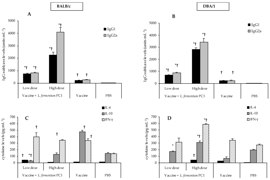 OVA-specific immune responses in BALB/c and DBA/1 mice. The mice were given OVA (1 mg per dose per mouse) with a PC1 low dose (108 CFU per dose per mouse) or high dose (1011 CFU per dose per mouse) on days 0 and 14. In addition, the mice received PC1 alone on days −1 and 13. The vaccine group received the OVA vaccine alone. PBS group received PBS as the negative control. On day 28, serum samples were collected and assayed for IgG subclasses in BALB/c (A) and DBA/1 (B) mice. Cytokines in spleens were also quantified in the BALB/c (C) and DBA/1 (D) mice. Antibody values are expressed as units mL−1 + SEM. Cytokine results are expressed as the mean + SEM. There were 10 mice in each group. Results from one representative experiment out of two are presented. * p < 0.05 compared to vaccine group; † p < 0.05 compared to PBS group.