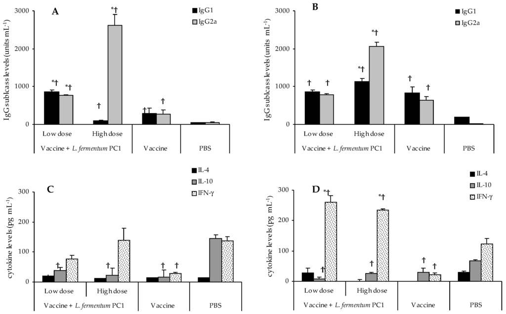 Significantly less serum IgG1 and IgG2a levels were obtained in vaccine-only mice than in those mice given PC1. The levels of IgG1 and IgG2a were comparable and indicative of a balanced Th1/Th2 response (Figure 2A,B).