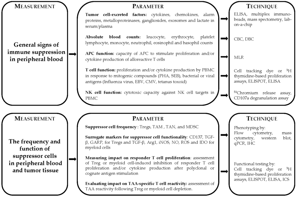 The measurement of immune dysfunction is important to improve current immunotherapeutic approaches and for the design of new strategies to alleviate immune suppression. This still requires a huge effort with respect to setting-up reliable phenotypic and functional monitoring tools of the suppressive cells, which are correlated with the clinical outcome of the cancer patients. When successful, this might lead to a higher percentage of patients who benefit from the treatment, as well as increase the duration of the clinical response.