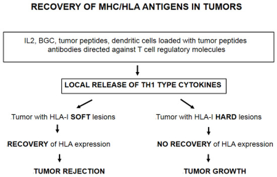 The analysis of different subcutaneous metastases obtained from a melanoma patient with mixed response to immunotherapy showed that regression or progression of metastatic lesions is associated with the presence of HLA-I molecules on the tumor cell surface [24,25,26]. Melanoma lesions with high HLA-I expression level were heavily infiltrated by CD4+ and CD8 positive T cells and were rejected. In contrast, metastatic lesions with low HLA-I expression were resistant to immunotherapy and progressed. These findings strongly suggest that immunotherapy induces tumor HLA-I upregulation and rejection of cancer cells with “reversible/soft lesions” [12] (Figure 1). Similar results were obtained in spontaneous metastases induced in a mouse fibrosarcoma [22]. In this context, it has been recently reported that the recurrent lesions in four melanoma metastatic patients treated with monoclonal antibodies directed against “immune checkpoint” molecules harbor mutations in β2-microglobulin and IFN genes, confirming the idea that different types of immunotherapy can activate T cell-mediated immune response and select tumor cells with irreversible/“hard” lesions [27] (Figure 1). IFNs and other TH1 type cytokines undoubtedly play a major role in the upregulation of tumor MHC-I expression and in the activation of antigen presentation, ultimately leading to tumor rejection [28,29].