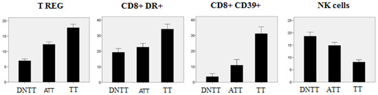 Variations in the percentage of lymphocyte subpopulations and natural killer (NK) cells in different areas of tumor and “normal” adjacent tissues measured by flow cytometry. DNTT—distant non tumor tissue, ATT—adjacent tumor tissue, TT—tumor tissue. The treg cell subset was defined as CD127low CD25bright CD4+. The number of Treg was calculated as a percentage of total number of CD4+ cells, while the CD8+ DR+ and CD8+CD39+ cell levels are shown as a percentage of CD8+ cells. NK cells were determined by the selection of CD45+ CD3− CD20− cells in the FSClow/SSClow gate [31]. Tregs and CD8+CD39+ lymphocytes show increased presence closer to the tumor nest, while the percentage of NK cells is lower in TT as compared to other areas.