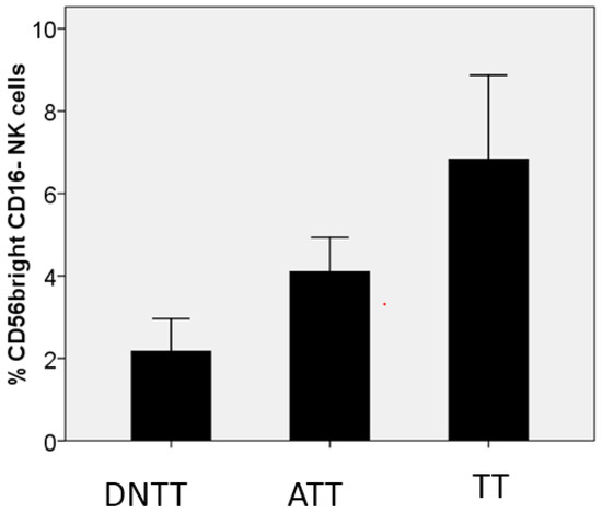 Changes in the percentage of CD56bright CD16− NK cells with impaired cytotoxic activity in different areas of the tumor and “normal” adjacent tissues analyzed by flow cytometry. TT is enriched by CD56bright CD16− NK cells, the percentage of which gradually increases from DNTT to TT. DNTT—distant non tumor tissue, ATT—adjacent tumor tissue, TT—tumor tissue. Tumor samples were obtained from primary lung tumors of non-treated patients by excision of a tumor mass fragment. ATT samples were taken from tumor-adjacent lung tissue located at approximately 1 cm from the periphery of the tumor without macroscopic signs of a tumor. DNTT and ATT samples were thoroughly analyzed to guarantee the complete absence of epithelial tumor cells. The NK cell subset was determined by the selection of CD45+ CD3− CD20− cells in the FSClow/SSClow gate and calculated as a percentage of all NK cells [31].