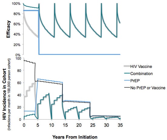 where t is the time in months since the first dose of the most recent vaccination series (see Figure 2 and Appendix Figure A2). We assumed that re-vaccination five years later boosted immunity to the initial levels followed by the same rate of exponential decay in protection from infection []. The PrEP-Vaccine combination strategy assumes the cohort of MSM initiates PrEP at the time of vaccination, and then they continue PrEP for five years and receive HIV vaccine boosts every 5 years (varying 0–10 years in sensitivity analyses). Figure 2 shows the average efficacy for each strategy over time. We assume that the combined effectiveness is multiplicative,