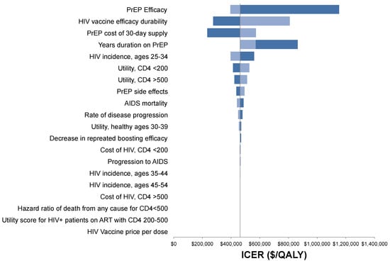 Tornado diagram of the one-way sensitivity analysis showing the impact of minimum and maximum parameter ranges on the ICER of the combination strategy versus HIV vaccines alone. Univariate sensitivity of the PrEP duration shows that 1 year or 10 years on PrEP in the combination strategy have larger ICERs than the base case assumption of 5 years duration, because the balance of lifetime PrEP costs and benefits is closer to the optimization of duration at 5 compared to 1 or 10 years.