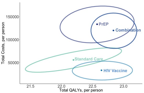 HIV vaccination alone dominated PrEP, as the vaccine had greater health gains and lower total costs than PrEP (Table 2 and Figure 3). Vaccines dominated standard care by $40,224 per QALY. The combination of PrEP with HIV vaccines had an ICER of $463,448 per QALY gained, as compared to HIV vaccines alone, and would not be cost-effective even given the upper-bound threshold of $150,000 per QALY.