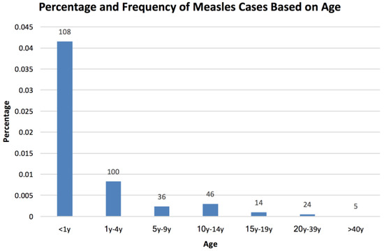 Children under the age of five were at the greatest risk for measles. Children under one year with measles lacked maternal immunity to the virus because their mothers were never vaccinated nor exposed to the MeV. The vaccination strategy for Ecuador for the year 2010 mandated two doses total at age one year and six years [19]. With a lack of maternal immunity, children under one year were vulnerable until their first dose of the vaccine [13,19]. Due to the increased rates of measles infection within the 1–4 years group, it is likely that these children also did not receive the MeV vaccine.