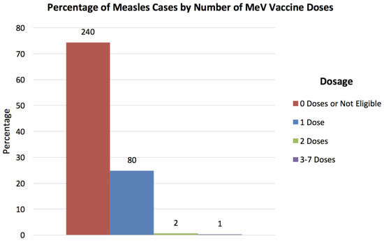 Percentage of measles cases by number of MeV vaccine doses. Out of the 333 measles cases, the percentages and number of people are presented for each number of MeV vaccine dose. The frequency of each group is labelled above each bar. People not eligible for the vaccine were grouped with “0 Doses”.