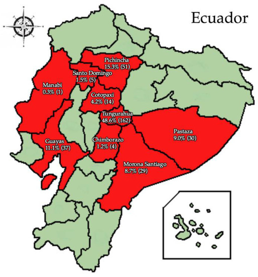 Percentage of measles cases by province in Ecuador. Out of the 333 measles cases, the percentages of cases each province had is shown. The frequency of cases in each province is also included in the parentheses.