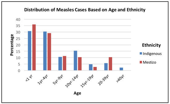 Distribution of measles cases based on age and ethnicity. Out of the 333 measles cases, the percentage of both Indigenous and Mestizo persons are shown within each age group.