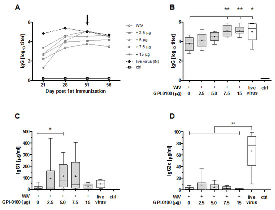 Effect of GPI-0100 on systemic antibody responses. Mice (n = 6 per group) were immunized via the pulmonary route on day 0 and 21 with powder vaccines containing A/PR/8 whole inactivated virus (WIV) (2.5 μg HA) alone or with the indicated amounts of GPI-0100. As a positive control, mice were sub-lethally infected by nose-restricted administration of 1000 TCID50 A/PR/8 on day 0 and 21. Control mice (ctrl) were non-immunized. On day 51, all mice were challenged with 100 TCID50 of A/PR/8 administered to the total respiratory tract. (A) A/PR/8-specific IgG responses evaluated in serum collected on days 21, 28, 51 and 56. Mean group titers calculated from individual titers are depicted. Arrow indicates day of challenge. (B) IgG, (C) IgG1 and (D) IgG2c after two immunizations. IgG antibody levels are expressed as log10 titers. IgG1 and IgG2c levels are shown as μg/mL. Results in B, C and D are shown as box and whisker plots depicting the median, mean, maximum and minimum of the group. Levels of significance are presented as * p < 0.05, ** p < 0.01.