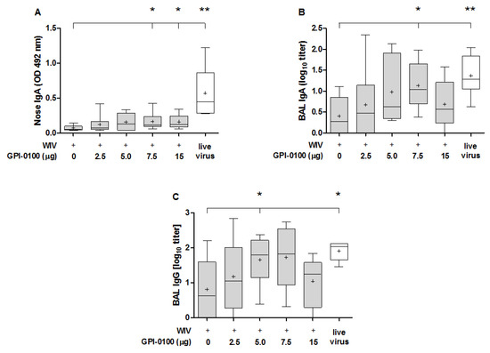 Effect of GPI-0100 on antibody responses in respiratory tract. Mice (n = 6) were vaccinated and challenged as described in the legend to Figure 1. Nose washes and bronchoalveolar lavages (BAL) were collected 5 days after challenge with A/PR/8, i.e., on day 56 and were analyzed for (A) nose IgA; (B) BAL IgA; and (C) BAL IgG. IgA responses in the nose wash are presented as absorbance at OD492 while BAL IgA and IgG antibody levels are expressed as log10 titers. Live virus = sublethally infected, challenged mice. Ctrl = non-immunized but challenged mice. Results are shown as box and whisker plots depicting the median, mean, minimum and maximum of the experimental group. Levels of significance are presented as * p < 0.05, ** p < 0.01.