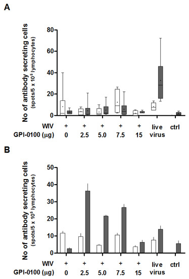 In order to determine the effect of GPI-0100 on the number of IgG- and IgA-producing B cells in the spleens and lungs found after challenge, antigen-specific B cell ELISpot assays were performed (Figure 3A,B). ELISpot results highlight that the number of spleen-resident B cells producing influenza-specific IgG was generally small and did not differ significantly between groups immunized with non-adjuvanted or GPI-0100-adjuvanted WIV, respectively (Figure 3A, white bars). No IgG-producing B cells were found in non-immunized but challenged control mice. This indicates that the antibody-secreting B cells present were the result of the prior vaccination rather than of the infection. Numbers of splenic B cells producing influenza-specific IgA were even lower and similar to those found in non-immunized, challenged control mice (Figure 3A, grey bars). Differences between mice immunized with adjuvanted and non-adjuvanted vaccine were therefore irrelevant. Only sublethally infected mice showed substantial numbers of IgA ASCs in the spleen.