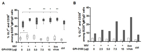 Effect of GPI-0100 on germinal center and memory B cell responses. Effects of GPI-0100 dose on germinal center (white) and memory (grey) B cells were evaluated in (A) splenocytes and (B) pooled lung cells of the mice described in the legend to Figure 1 five days after challenge. B cells in germinal centers were evaluated by determining the percentage of GL7+ cells among total class-switched B cells (B220+IgM−IgD−). Similarly, memory B cells were evaluated by determining the percentage of CD38+ cells among total class-switched B cells. Live virus = sublethally infected, challenged mice; ctrl = naïve, challenged mice. Splenocytes were analyzed for individual mice and data are depicted as box and whisker plots per experimental group. Lung lymphocytes were pooled per experimental group. Levels of significance are presented as * p < 0.05, ** p < 0.01.