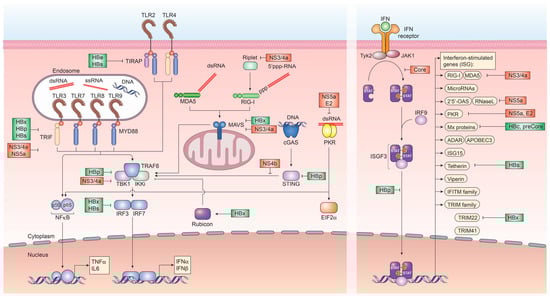 Chronic viral hepatitis (CVH) infections are a major global public health concern with more than 240 million and 70 million people infected with hepatitis B virus (HBV) and hepatitis C virus (HCV), respectively [,]. Both viruses persist within infected hepatocytes in the liver, where they eventually result in the development of liver fibrosis, cirrhosis and hepatocellular carcinoma []. Despite the similarity in disease progression and target cells, HCV and HBV have developed complex but nearly opposing strategies of ensuring persistence within infected individuals. While HCV infection usually results in vigorous innate immune activation during infection, the clinical symptoms of acute infection are often subclinical and may go unnoticed [,]. In contrast, acute HBV infection is usually easily detectable through the accompanying symptoms []. However, HBV itself seems to engage far fewer innate and inflammatory pathways, compared to HCV infection.
