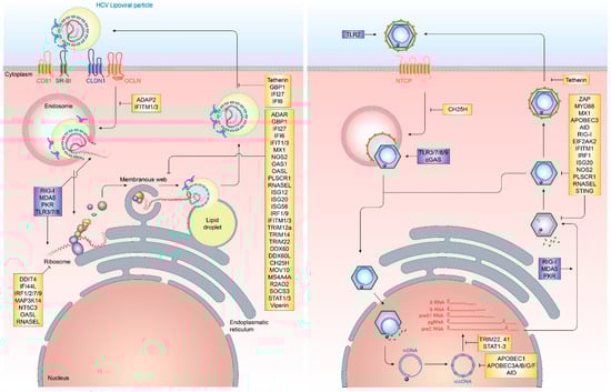Cell-intrinsic innate immune responses are among the first line of defense against incoming infectious diseases. Pattern-recognition receptors (PRR) located on the cell membrane, intracellular vesicles or within the cytoplasm recognize conserved pathogen-associated molecular patterns (PAMP), including foreign proteins, lipids and nucleic acids, resulting in the initiation of signal transduction pathways, culminating in the production of pro-inflammatory cytokines and interferons (IFN) [] (Figure 1). Three distinct classes of IFN can be produced by different cell types, type I (IFNα, IFNβ), type II (IFNγ) and type III (IFNλ1, IFNλ2, IFNλ3, IFNλ4) [,]. Once produced, they are secreted and bind to their cognate receptors (IFNAR1/2 for type I IFN, IFNGR for type II IFN and IL28RA/IL10R2 for type III IFN) in an autocrine or paracrine manner and trigger the JAK/STAT signal transduction pathway. For type I and III IFN, this, in turn, results in the up-regulation of hundreds of interferon-stimulated genes (ISG), which exert antiviral functions []. These ISG can be broadly classified into several categories. In the case of HCV, these include ISG with direct antiviral function, including inhibitors of HCV entry, translation, replication and release as well as ISG, which are part of the active sensing and transcriptional activation system or negative regulators of innate immune activation (Figure 2 and Table 1). There are numerous ISGs that have been identified playing a role during the HCV viral life cycle, more extended information can be found in the review published by Bartenschlager and colleagues []. Expression of these ISG is mainly aimed at restricting the spread of viral infections to allow for the induction of cellular innate and adaptive immune responses. In cases, where viral replication cannot be controlled by the antiviral effector function of ISG, they can additionally result in cell death of infected cells, in order to restrict viral spread.