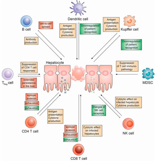 Cell-based innate immune responses against HBV and HCV have been extensively studied in the past years. These include Natural Killer (NK) cell, NKT cells, monocyte/macrophage, dendritic cells as well as specialized myeloid subpopulations (e.g., myeloid-derived suppressor cells) (Figure 3).