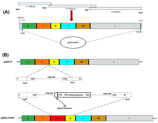 The full-length clone of NDV F (pNDV-F) was assembled in pCI vector from three synthetic overlapping clones, F1, F2 and F3, as shown in Figure 1A. In generating the IBDV VP2 gene cassette, the full-length VP2 gene of IBDV was inserted between the non-coding regions of the P and M genes of the full length clone with a size of 2913 bp, incorporating the necessary start and stop signals from NDV and the signal sequence of HN of NDV at the 5′ end of VP2 to express and incorporate the VP2 in NDV (Figure 1B). The total size of the pNDV-F/VP2 was precisely 16,872 bp, which followed the ‘rule of six’.