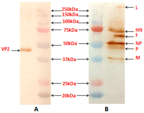 Western blot analysis of the proteins produced by purified recombinant NDV containing VP2 gene of infectious bursal disease virus (IBDV). Purified virus samples were separated on 12.5% sodium dodecyl sulfate polyacrylamide gel electrophoresis (SDS-PAGE). Proteins were then transferred to nitrocellulose membrane and blocked in 1% BSA in TBST. Membranes were incubated with either mouse anti-VP2 monoclonal antibody or chicken anti-NDV polyclonal antibody at 4 °C for 1 h. Membranes were washed in TBST and then incubated with secondary antibody conjugated with HRP in 1% BSA in TBST for 1 h at room temperature. Membranes were washed in TBST and incubated with Sigma Fast DAB (Sigma, USA) color development reagent for 15 min and then visualized. (A) The position of the VP2 protein of about 48-kDa (right) and marker proteins (Precision Plus Protein Standards, Bio-Rad, USA) are as indicated. The blot was probed with anti-mouse IBDV-VP2 monoclonal antibody (Abcam, USA). (B) The positions of the NDV L, HN, F, NP, P and M (right) and marker proteins are as indicated. The blot was probed with anti-chicken NDV polyclonal antibody.