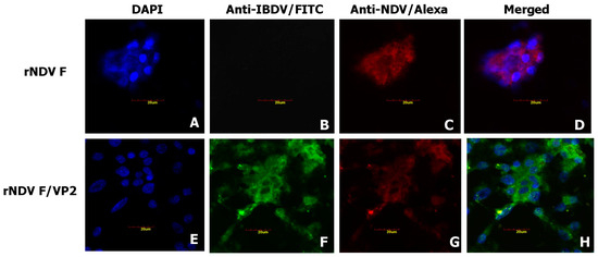 Expression of the VP2 protein in rNDV-F/VP2 virus was examined by IFA using IBDV-specific monoclonal antibody (mAb) against the VP2 protein (Abcam, USA; 1:100) and an NDV-specific polyclonal antibody (Abcam, USA; 1:50). Briefly, confluent monolayers of Vero cells were infected with recombinant viruses at a multiplicity of infection (MOI) of 0.01. After 24 h, the infected cells and control cells were washed with phosphate-buffered saline (PBS) and fixed with 4% paraformaldehyde (Affymetrix Inc., Cleveland, OH, USA) for 1 h at room temperature, followed by addition of 0.5% Triton X-100 (Sigma, USA) to permeabilize the cells at room temperature for 10 min. The permeabilized cells were blocked with 5% bovine serum albumin (Sigma, USA) for 30 min at 37 °C. After blocking, the cells were incubated for 1 h with a mixture of antibodies. Cells were washed with PBS and incubated with a mixture of the FITC labeled sheep anti-mouse IgG (Sigma, USA, 1:250 dilution) and Alexa Fluor(R) 568-labeled goat anti-chicken IgG (Thermo Fisher Scientific, Carlsbad, CA, USA, 1:200 dilutions) for 1 h at 37 °C. Nuclear staining was carried out using DAPI (Thermo Fisher Scientific, USA, 1:200 dilutions). Fluorescence images were photographed using a FluoViewFV1000 confocal microscope (Olympus, Waltham, MA, USA) with matching excitation/emission filters for FITC and Alexa Fluor 568.