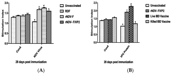 At 28 days post immunization (dpi), peripheral blood mononuclear cells (PBMCs) were collected from both vaccinated and unvaccinated control groups (n = 6) by using ficoll-hypaque (specific gravity 1.077 g/mL) (Sigma, St. Louis, MO, USA). The viability of cells was checked by trypan blue dye exclusion assay. The cell number was adjusted to be at 1 × 107 cells/mL. One hundred microliters of medium with cells were added in triplicates to the cell culture plates and stimulated with recombinant VP2 protein at a concentration of 5 µg/mL, and virulent NDV at a concentration of 10 µg/mL; ConA (10 µg/mL) was used as positive control along with non-stimulated control. The plates were incubated at 37 °C in 5% CO2 atmosphere with 95% relative humidity. After 60 h, 20 µL of MTT dye (5 mg/mL) was added to all the wells and incubated for further 4 h. One hundred microliters of DMSO was added to all the wells and mixed to dissolve the formazan crystals. Spectrophotometric reading was taken at 570 nm and stimulation index (S.I) was calculated as the ratio between mean OD value of stimulated cells and the mean OD value of the non-stimulated control.